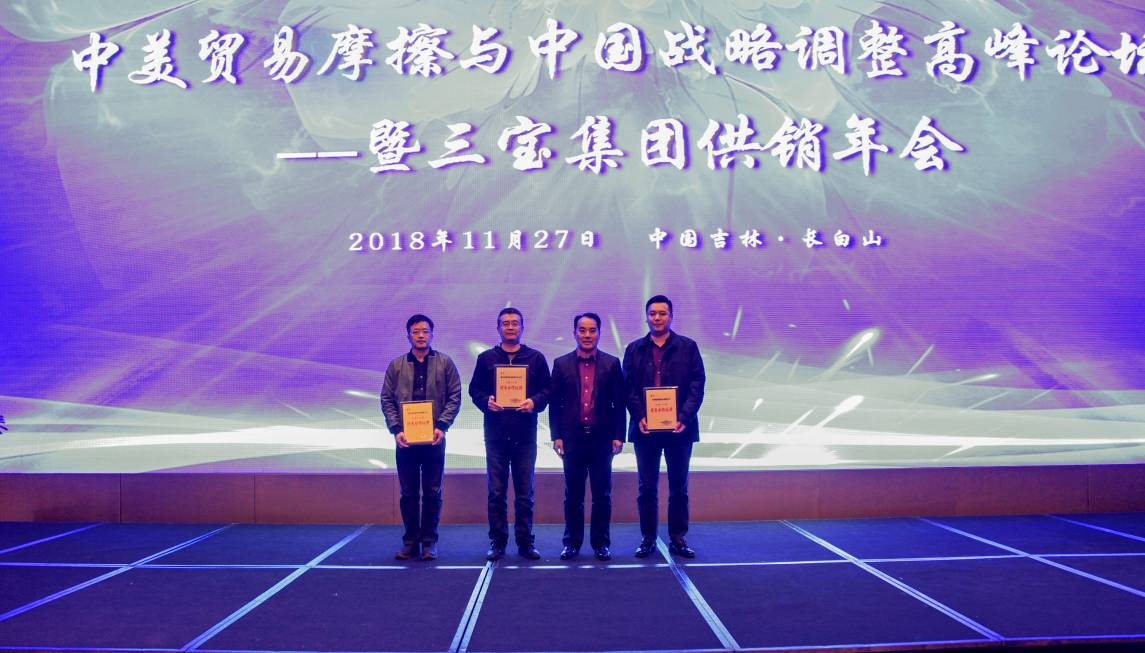 2018年11月27日,“中美貿(mào)易摩擦與中國(guó)戰(zhàn)略調(diào)整高峰論壇----暨三寶集團(tuán)供銷年會(huì)”在中國(guó)吉林長(zhǎng)白山隆重召開(kāi)。年會(huì)邀請(qǐng)了三寶集團(tuán)的經(jīng)銷商、供應(yīng)商及合作伙伴等33家企業(yè)以及上海鋼聯(lián)、廈門鋼協(xié)及上海財(cái)經(jīng)大學(xué)經(jīng)濟(jì)學(xué)教授余智先生等,集團(tuán)董事長(zhǎng)王光文、董事長(zhǎng)夫人蘇玉妹、副總黃漢國(guó)參加本次會(huì)議。