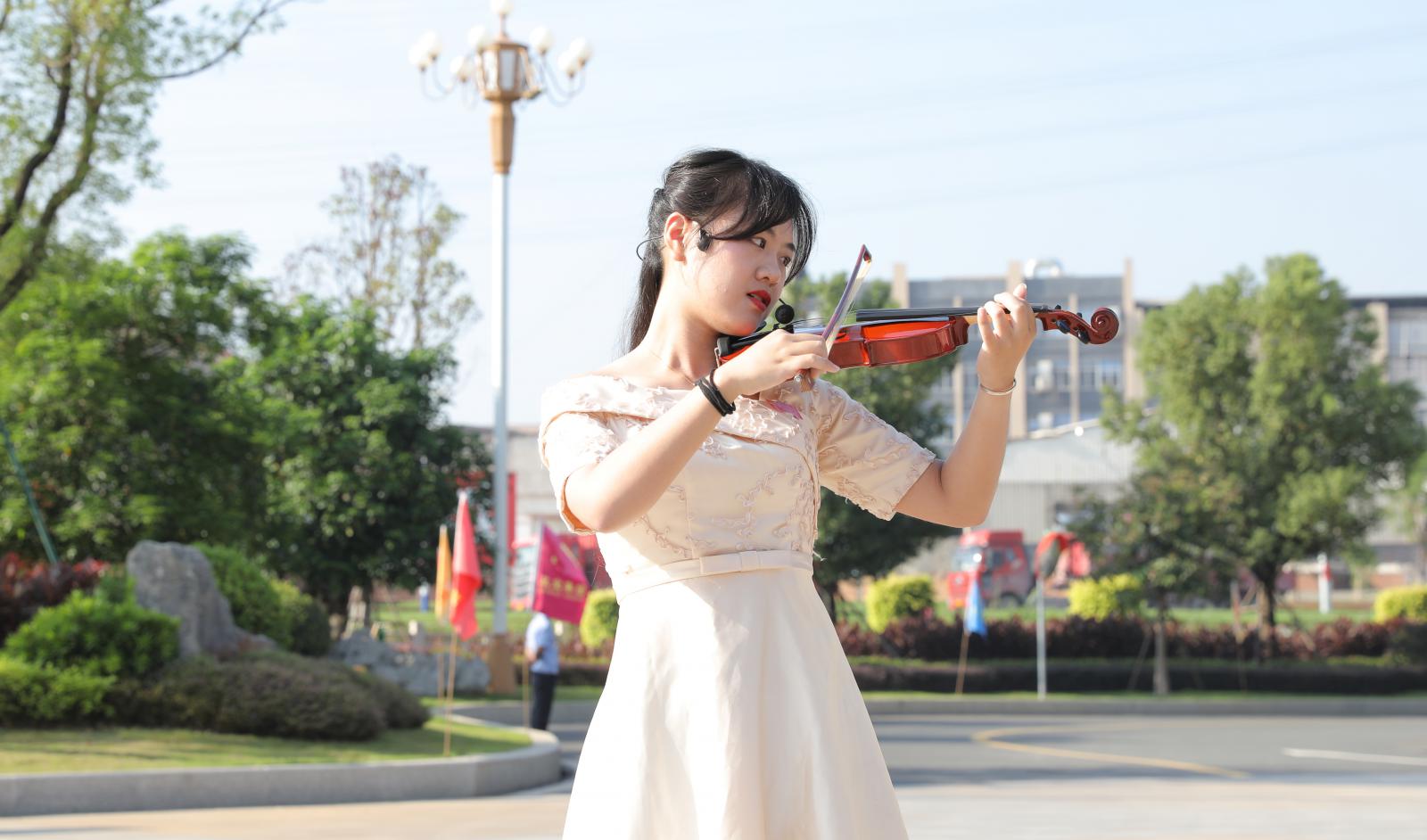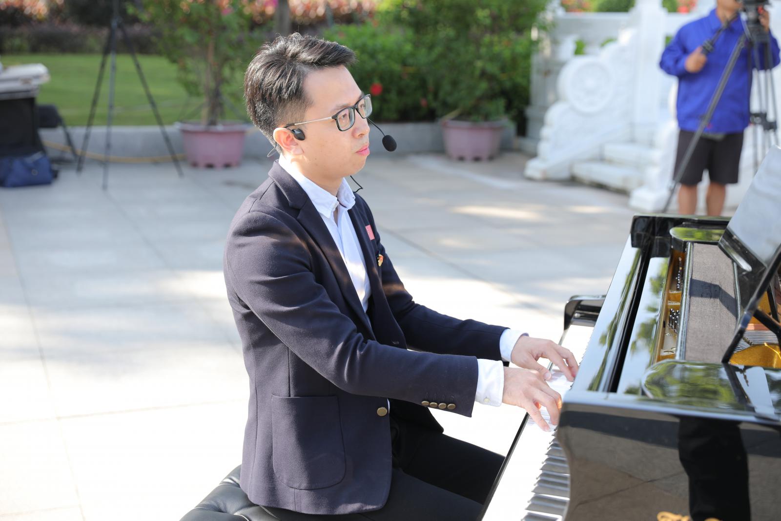 升旗禮畢,“五星紅旗迎風(fēng)飄揚(yáng),勝利歌聲多么嘹亮,歌唱我們親愛(ài)的祖國(guó),從今走向繁榮富強(qiáng)”。清澈的女高音劃破長(zhǎng)空,小提琴和鋼琴聲此起彼伏,交相輝映,從女聲獨(dú)唱,到女聲合唱,再到男聲合唱,男女聲齊唱,最后全場(chǎng)大合唱,三寶人把心中對(duì)祖國(guó)的熱愛(ài),都化作這一曲《歌唱祖國(guó)》。