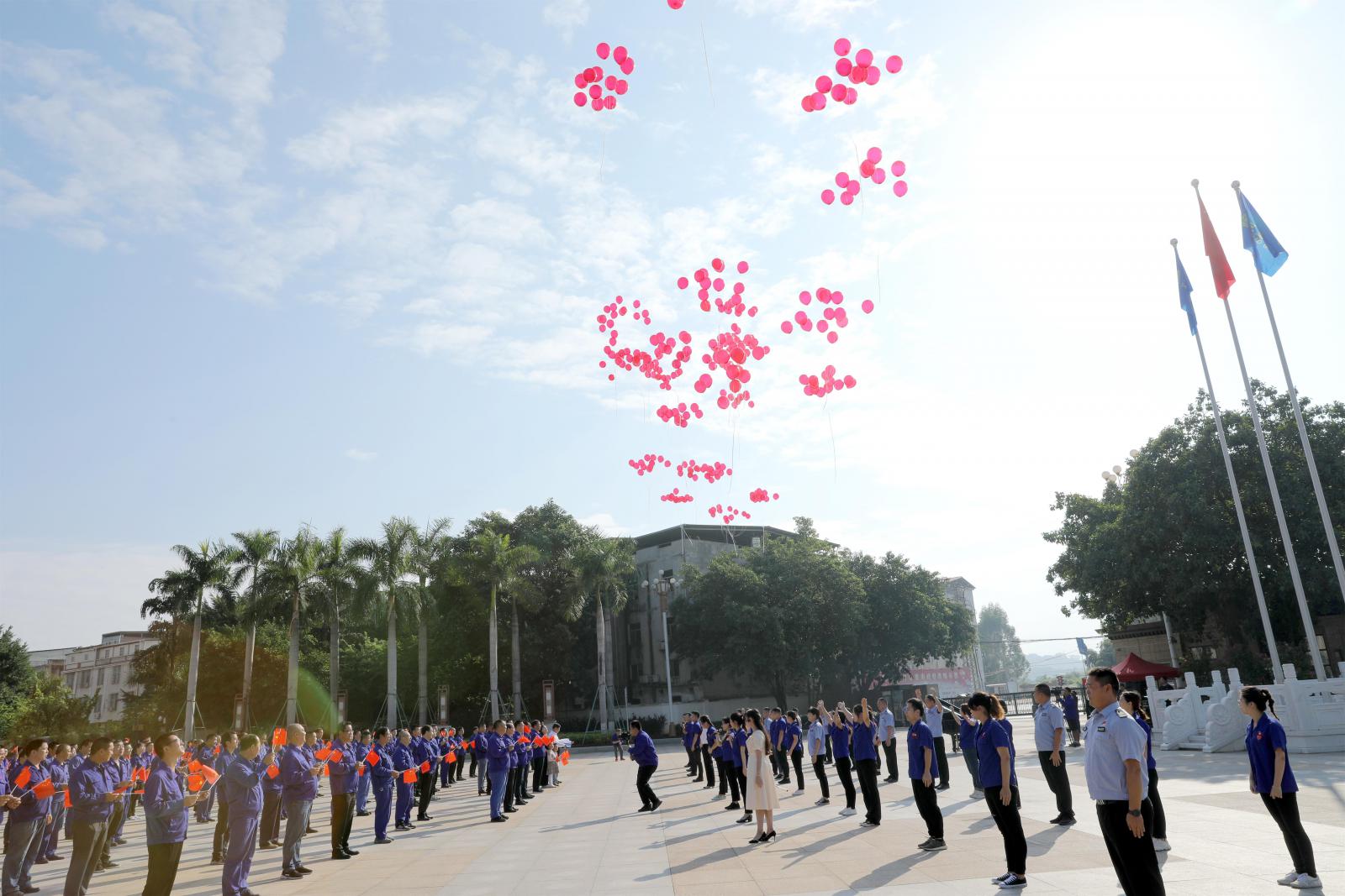 伴隨著悠揚(yáng)的音樂(lè),第二批快閃人員揮舞著五星紅旗,從四面八方齊聚廣場(chǎng),精神飽滿地唱響《三寶之歌》。將整個(gè)快閃活動(dòng)再一次推向高潮。而在廣場(chǎng)的后半部分,幾面鮮紅的黨旗整齊一致,左右搖曳。最后,所有快閃人員放飛手中的氣球,飛舞的氣球寄托了三寶人對(duì)祖國(guó)的祝愿,也為本次快閃活動(dòng)畫(huà)上了一個(gè)圓滿的句號(hào)。