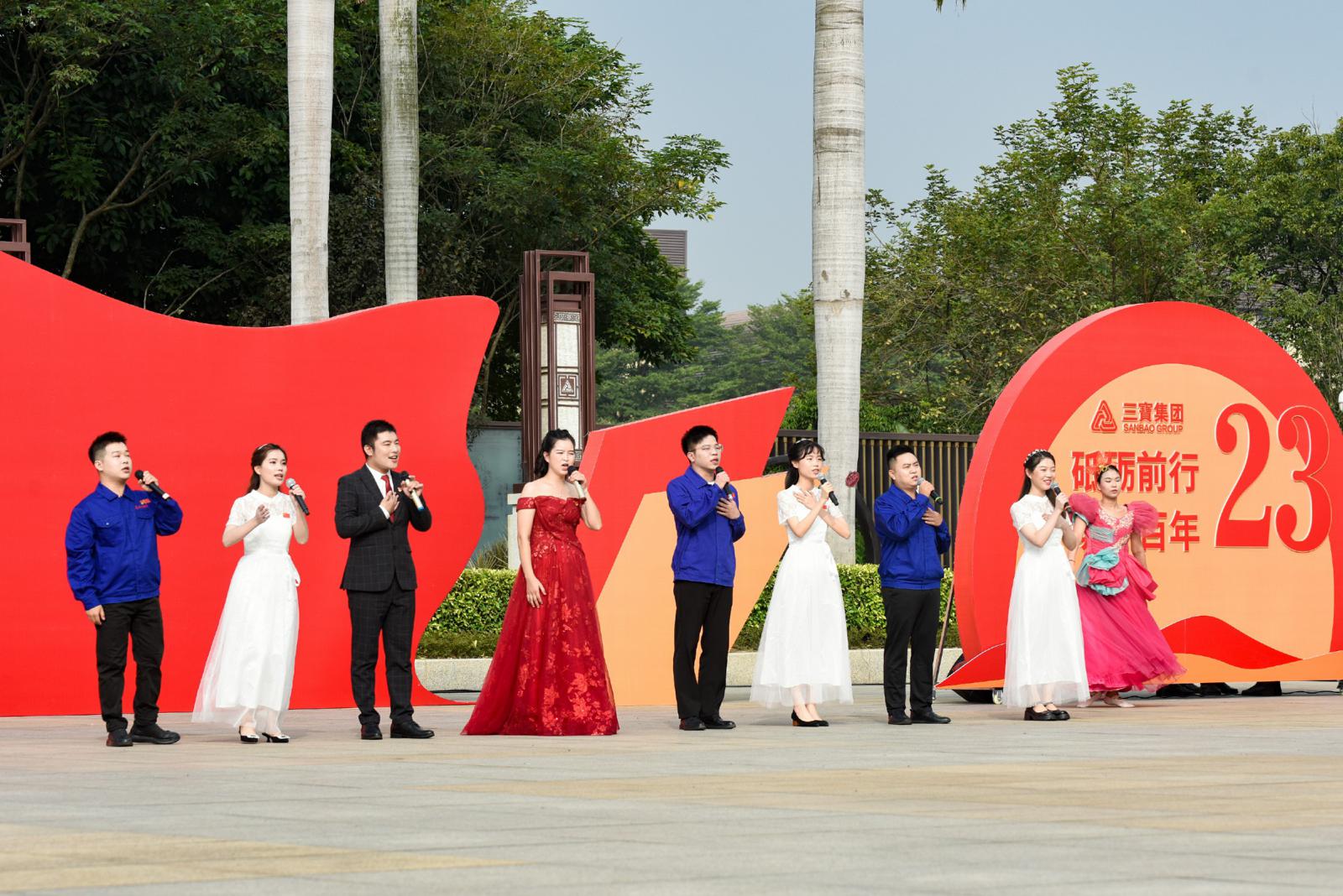 升旗儀式后,全體人員手揮小國旗,觀看《今天是你的生日》、《我愛你中國》歌舞表演并齊聲高唱《我和我的祖國》,送上對祖國73周年華誕和三寶成立23周年的美好祝福。