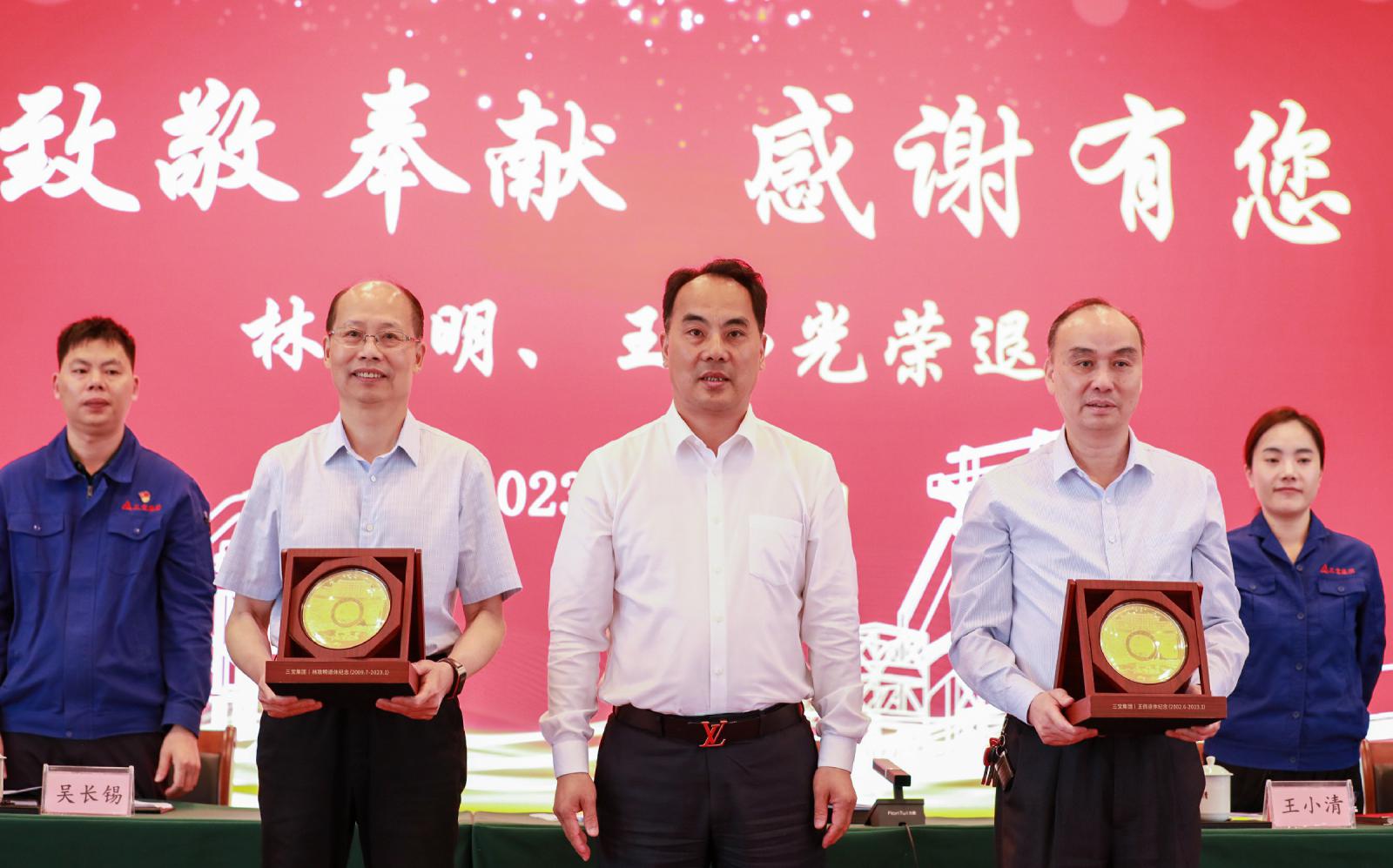 大會(huì)舉行老干部光榮退休儀式。王董事長(zhǎng)為退休干部林致明、王偉頒發(fā)光榮退休紀(jì)念金牌,并向光榮退休的干部員工致敬,感謝他們?yōu)槿龑氉龀龅呢暙I(xiàn)。