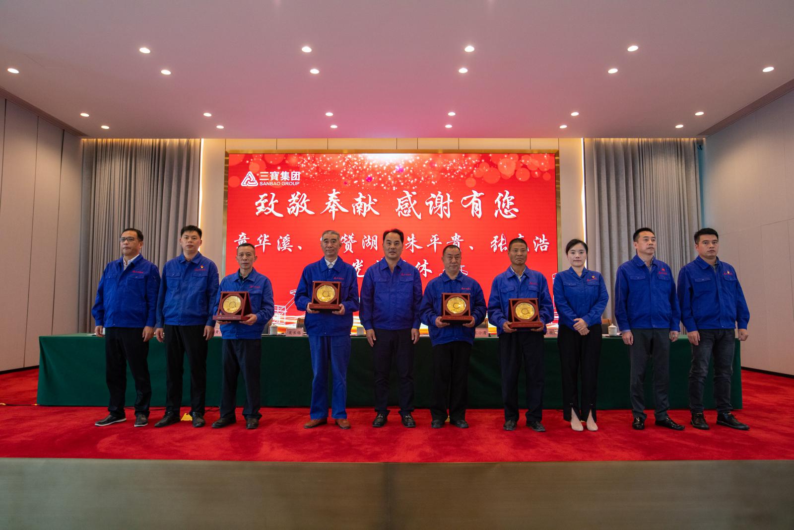 大會還舉行了老員工光榮退休儀式。王董事長為四位工齡滿二十年的老員工章華溪、肖贊湖、朱平貴、張克浩頒發(fā)光榮退休紀念金牌。