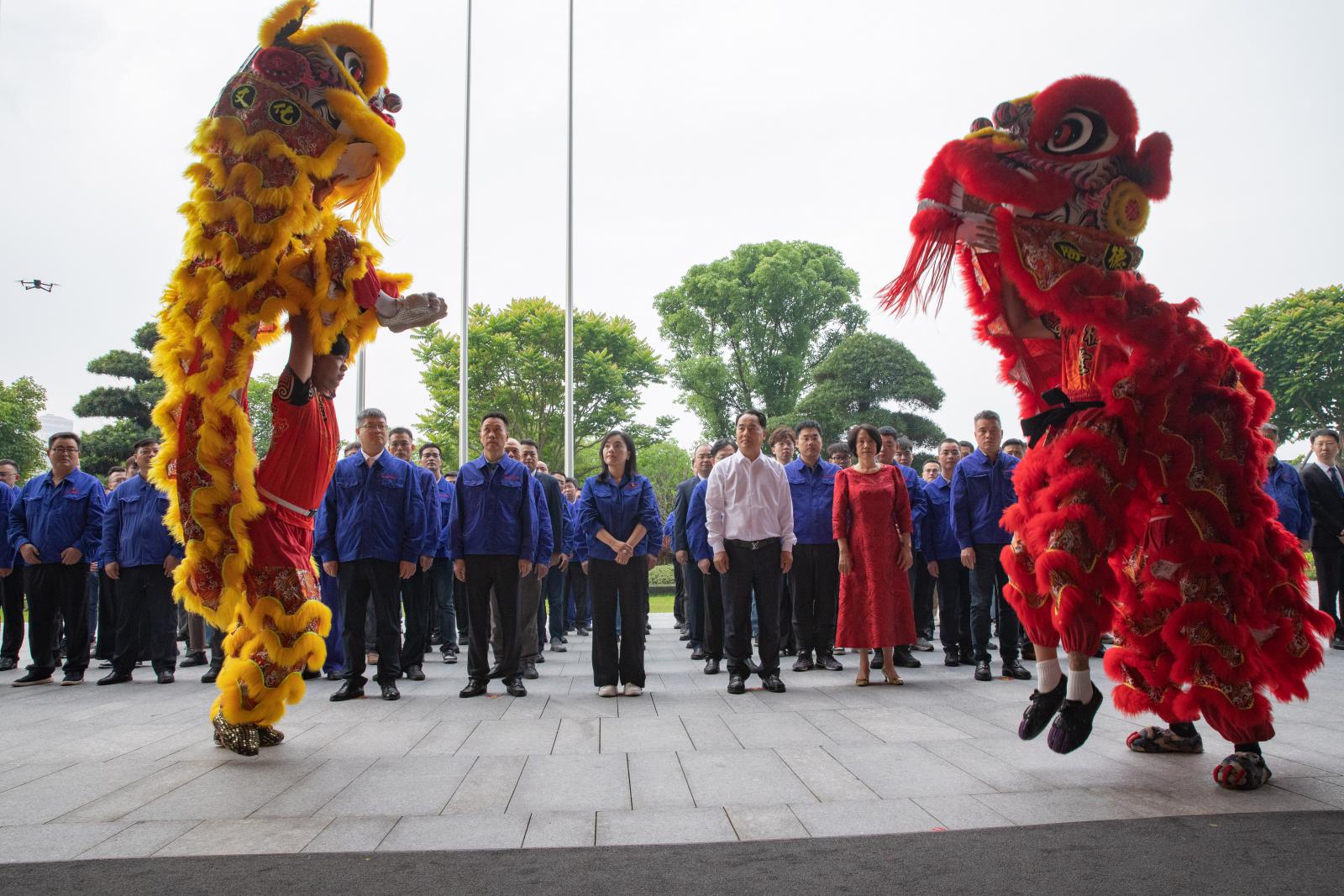 擂鼓震天,祥獅獻(xiàn)瑞。在精彩的舞獅表演結(jié)束后,董事長(zhǎng)王光文先生與夫人蘇玉妹女士共同為新辦公樓揭幕,并宣布總部辦公樓正式喬遷。